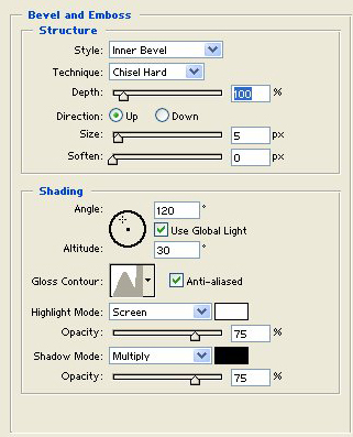 Inner Bevel and Chisel Hard. Make sure Anti-Alias is checked. Choose