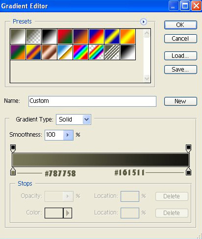 to White Gradient is selected (should be the default), click on the first color stop and use #787758. On the second (right) color stop, utilize #161511.