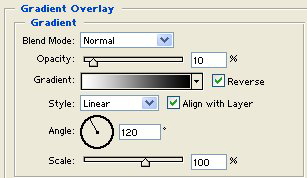 Gradient Overlay: Blend Mode > Normal, Opacity > 10, Style > Linear.