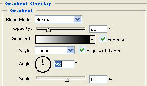 Gradient Overlay: Blend Mode > Normal, Opacity > 25%, Style > Linear, Angle > 98.