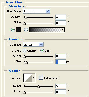 Inner Glow: Blend Mode > Normal, Opacity > 6, Technique > Softer, Source > Edge, Size > 7.