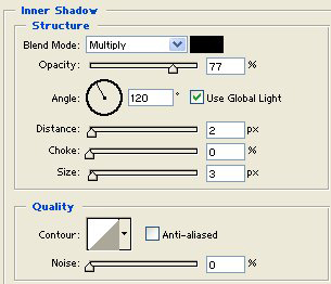 Inner Shadow: Blend Mode > Multiply, Opacity > 77%, Distance > 2, Size > 3.