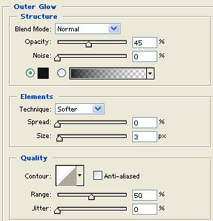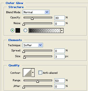 Outer Glow: Blend Mode > Normal, Opacity > 30%, Color > #161616, Technique > Softer, Size > 3.