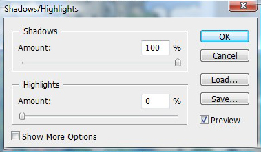 Image > Adjustments > Shadow/Highlight. Bring the Amount up to 100%.